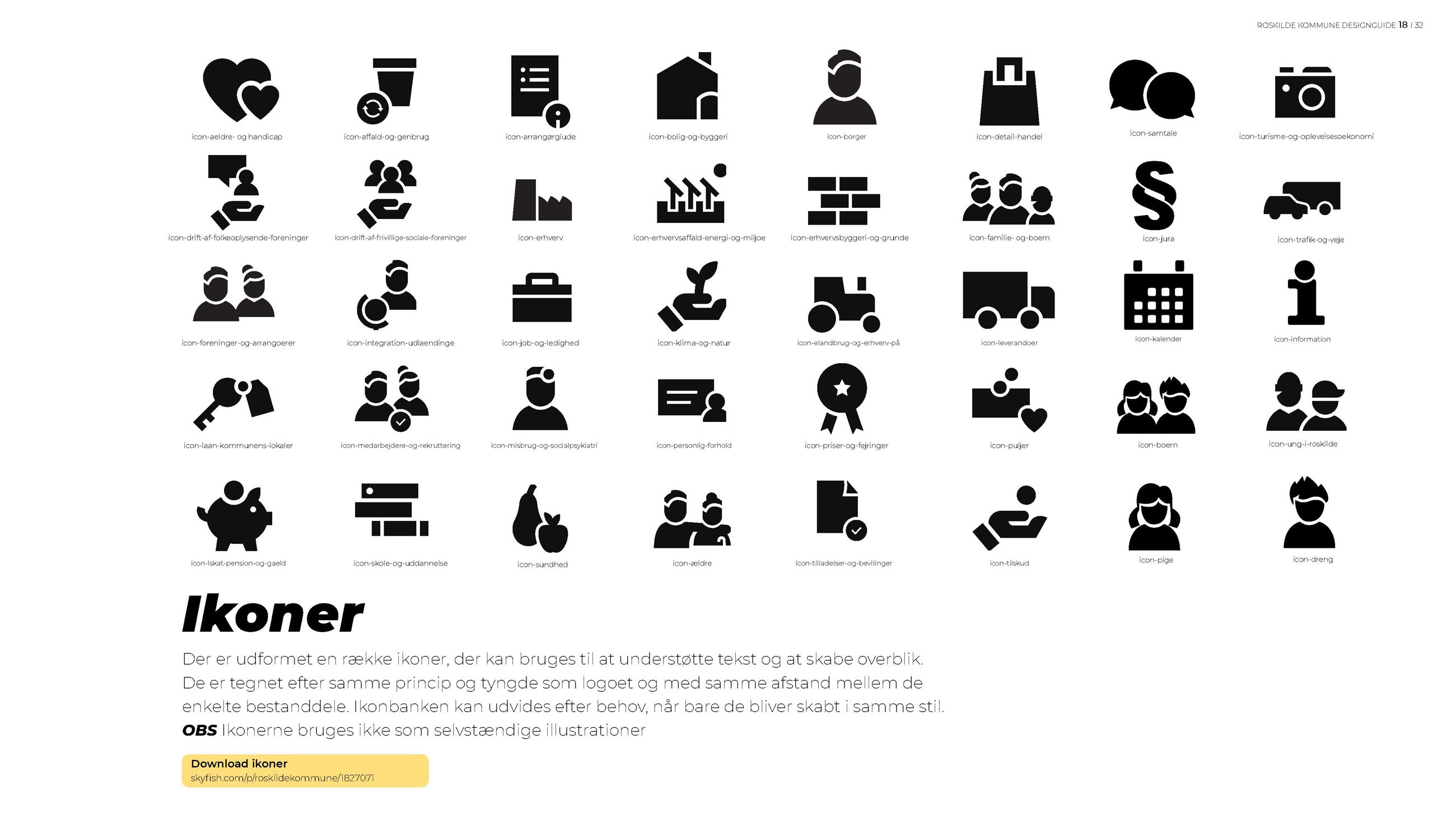 Vi har en række ikoner, der går igen fra roskilde.dk og kan bruges til at skabe overblik. Vi bruger ikke ikoner, som enkelte billedelementer. Find i stedet et godt foto.
