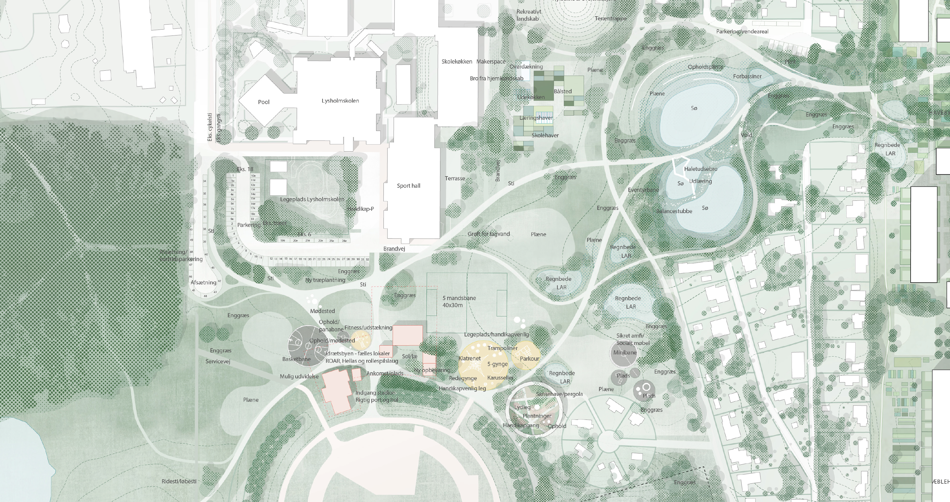 Bydelens mange grønne områder og oaser forbindes fra "Baghaven" gennem "Havebyen" og kolonihaverne i HF Solvang til "Idrætshaverne" for at ende i Hyrdehøjskoven. Haveforbindelsen bliver næsten en kilometer lang og arealmæssigt lidt større end Byparken i Roskilde.