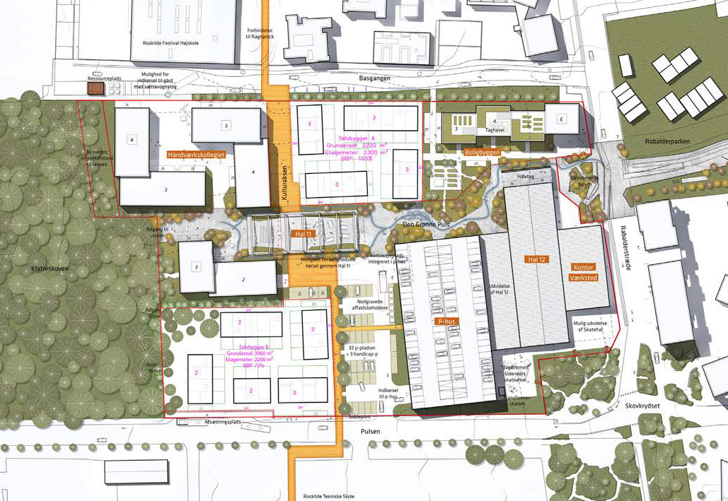 Mellem håndværkskollegiets bygninger er der tegnet små stræder, som fletter sammen med, hvad der kaldes Den Grønne Puls. Det er et øst-vestgående strøg, der binder Musiconlunden i vest sammen med Rabalderparken i øst.