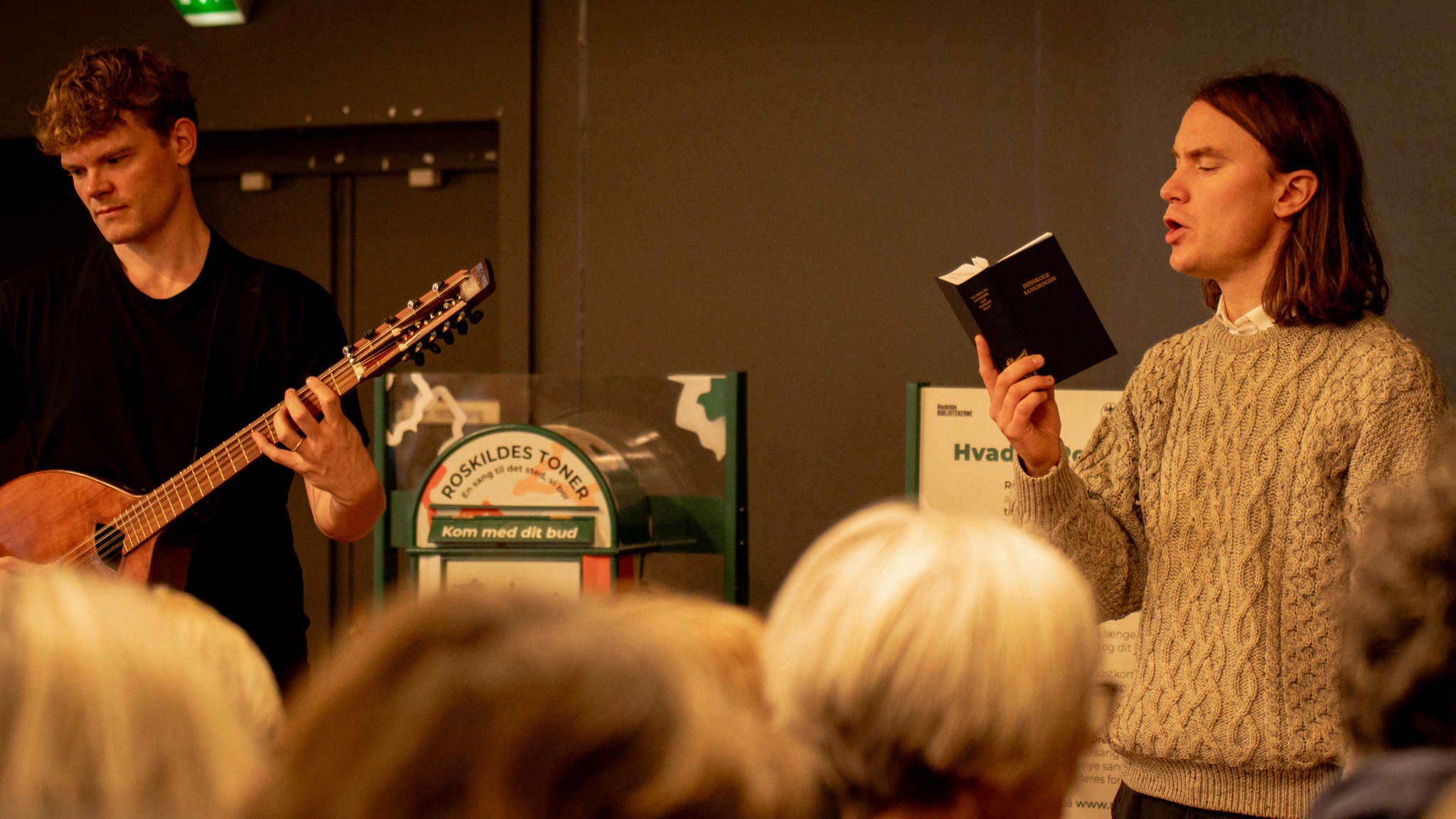 Der var fuld sal og friske morgenstemmer, da Bisse og 2/3 af Dreamers' Circus spillede op til fællessang på Roskilde Bibliotek tirsdag d. 7. oktober.
