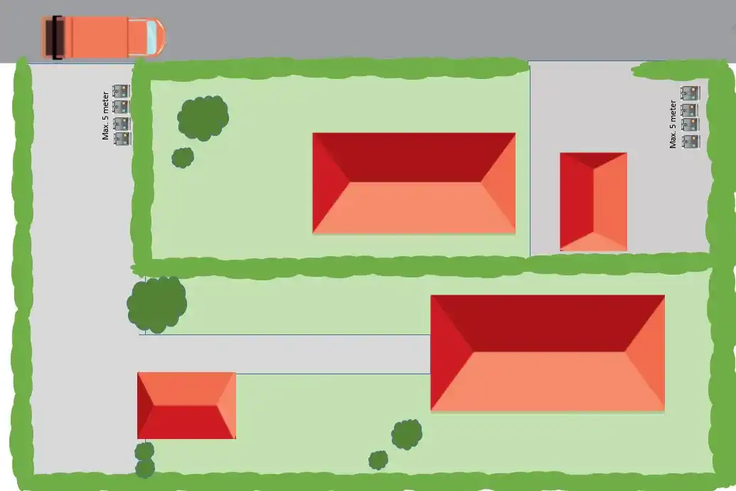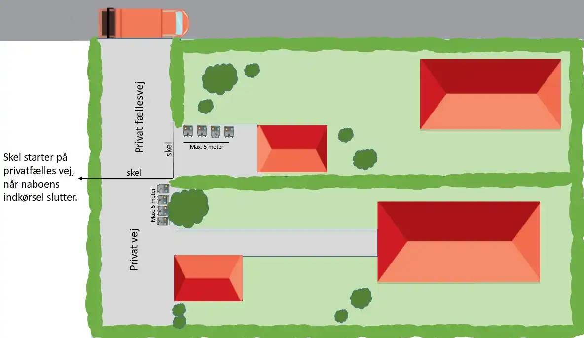 - Placering i forhold til skel: Beholderne må maks. stå 5 meter fra skel. Hvis de står længere væk, tømmes de kun, hvis der er tilkøbt lang adgangsvej.