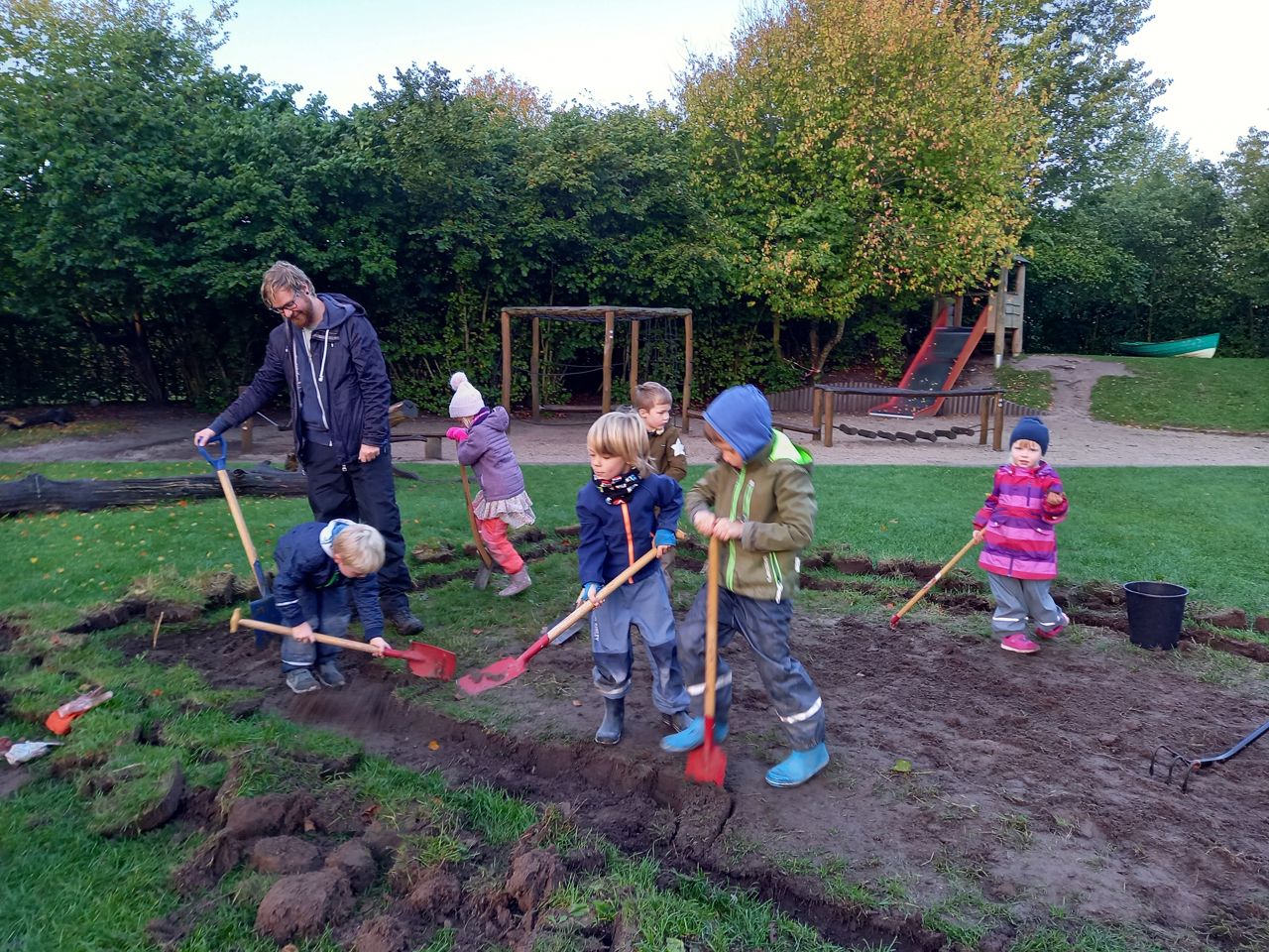 Vi vægter stor brug af uderummet og har indrettet værksted på legepladsen, hvor børnene kan tilgå kreative materialer og være skabende. Vi har et bålhus og køkkenhaver og høster gerne sammen med børnene, så de ser processen fra jord til bord. Vi er ved at skabe et stykke eng på plænen, for at lære børn om biodiversitet.