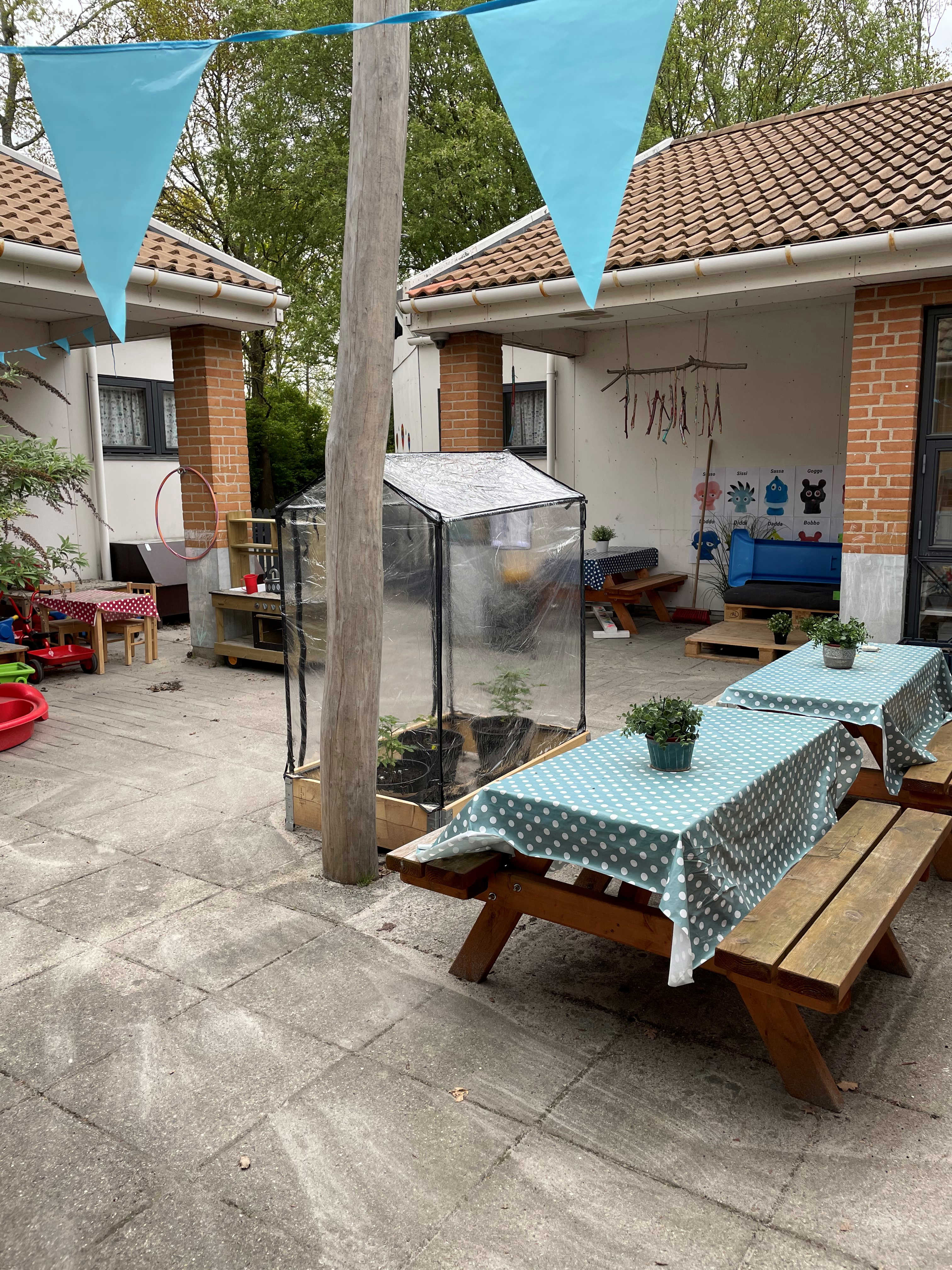 Naturen, legepladsen og sansehaven bruges som ekstra læringsrum med tilpassede miljøer til både vuggestue og børnehave. Vi er ude i al slags vejr og bruger naturens elementer til at styrke krop, sanser, motorik og fantasi. Vi mærker kulde og varme, kaster blade op i luften, ligge på ryggen og ser på skyerne, eksperimentere med mudder, vand og vind.