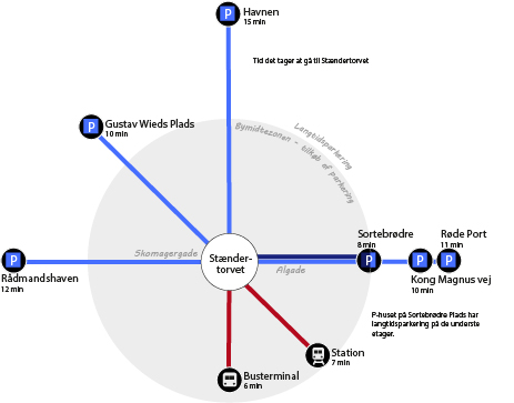 Vær opmærksom på, at visse pladser i bymidten er private, hvor der gælder andre regler. De er markeret med sorte skilte ved p-pladserne og med sort farve på korte længere nede på siden.