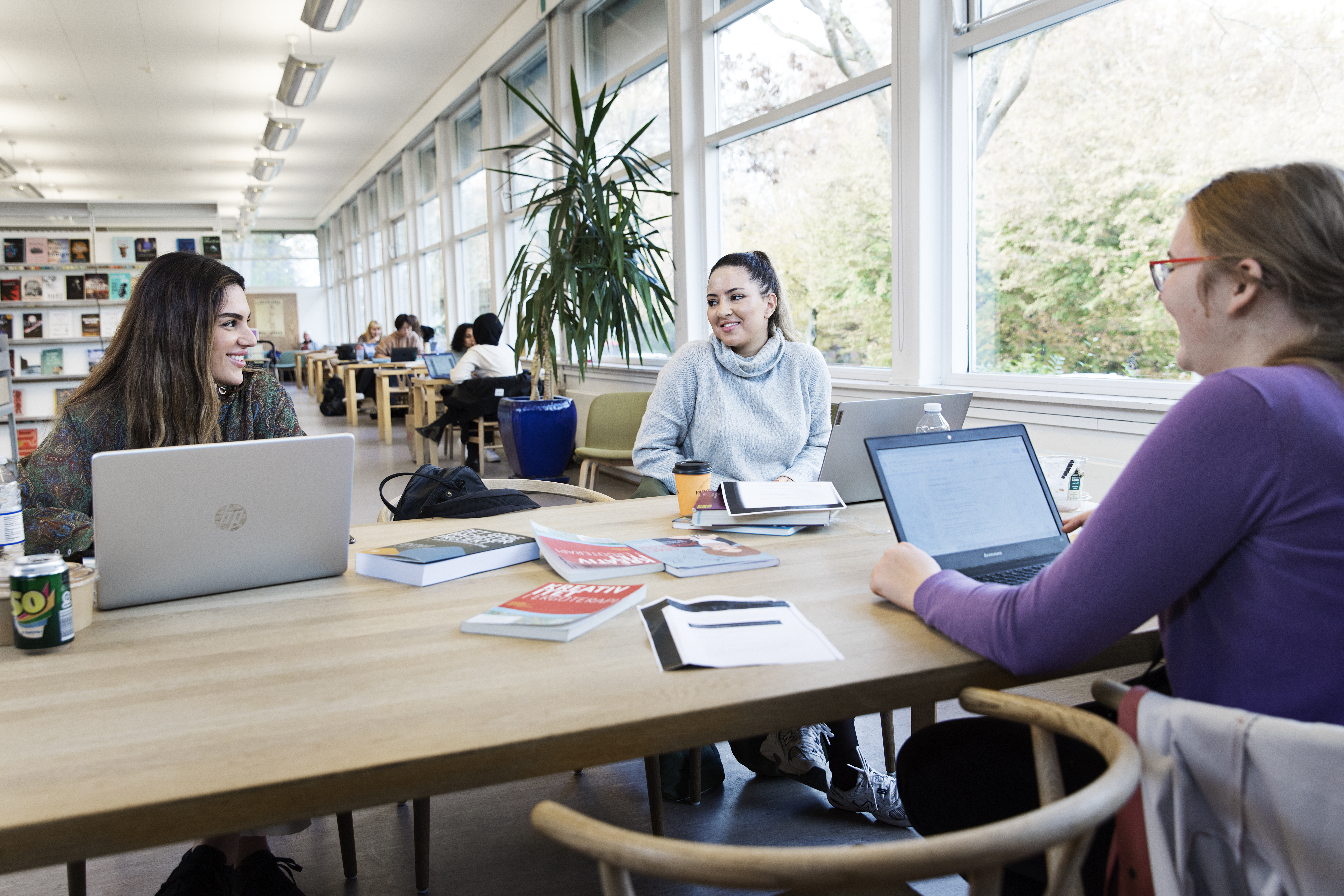 På Roskilde Bibliotek er der plads til dig, din computer, din studiegruppe og alle dine spørgsmål. Der er en lille café, (hvor de også sælger det fineste budgetvenlige keramik, produceret på en skole for voksne med handicap), og du kan få hjælp til at finde de rigtige bøger til din eksamen.
